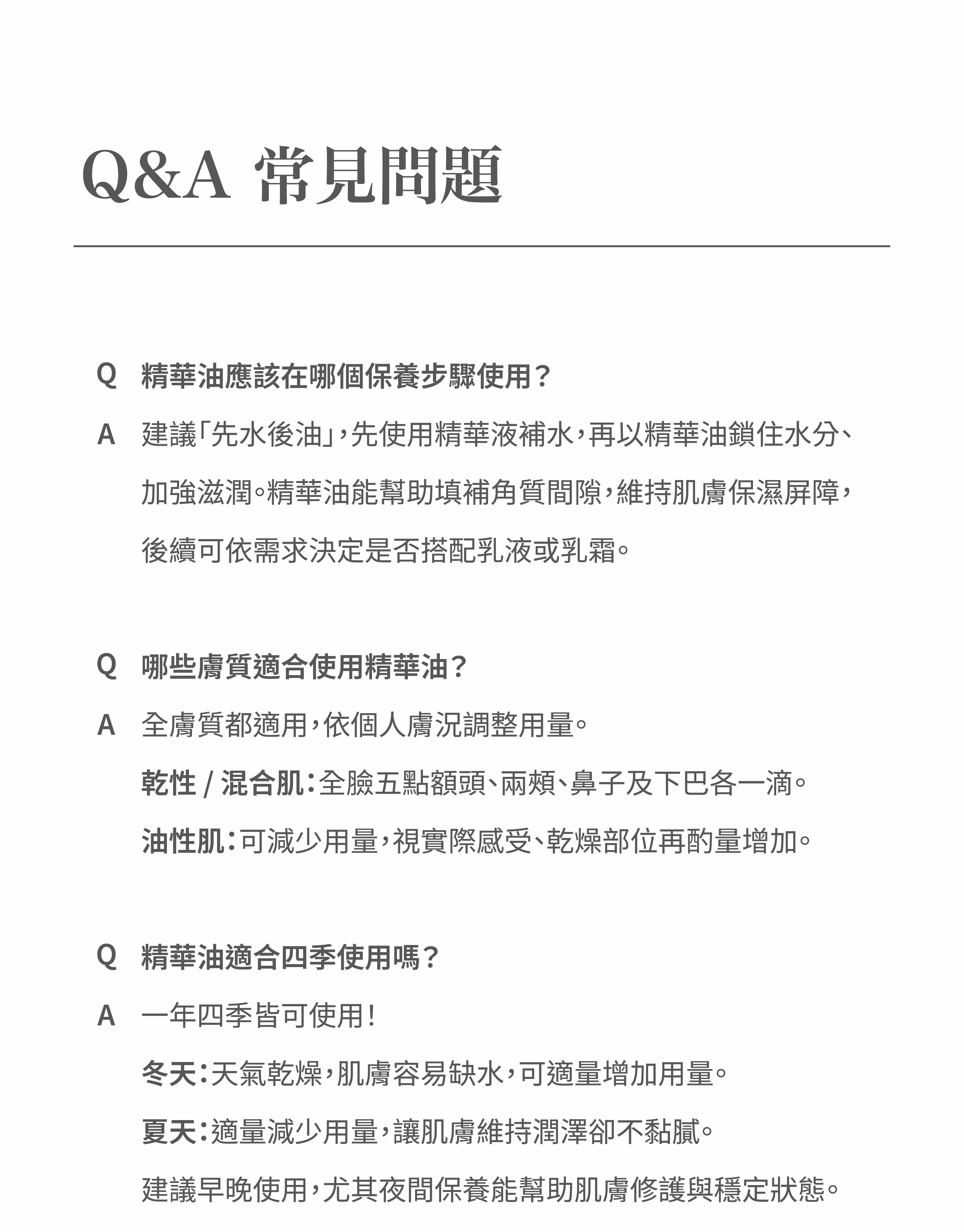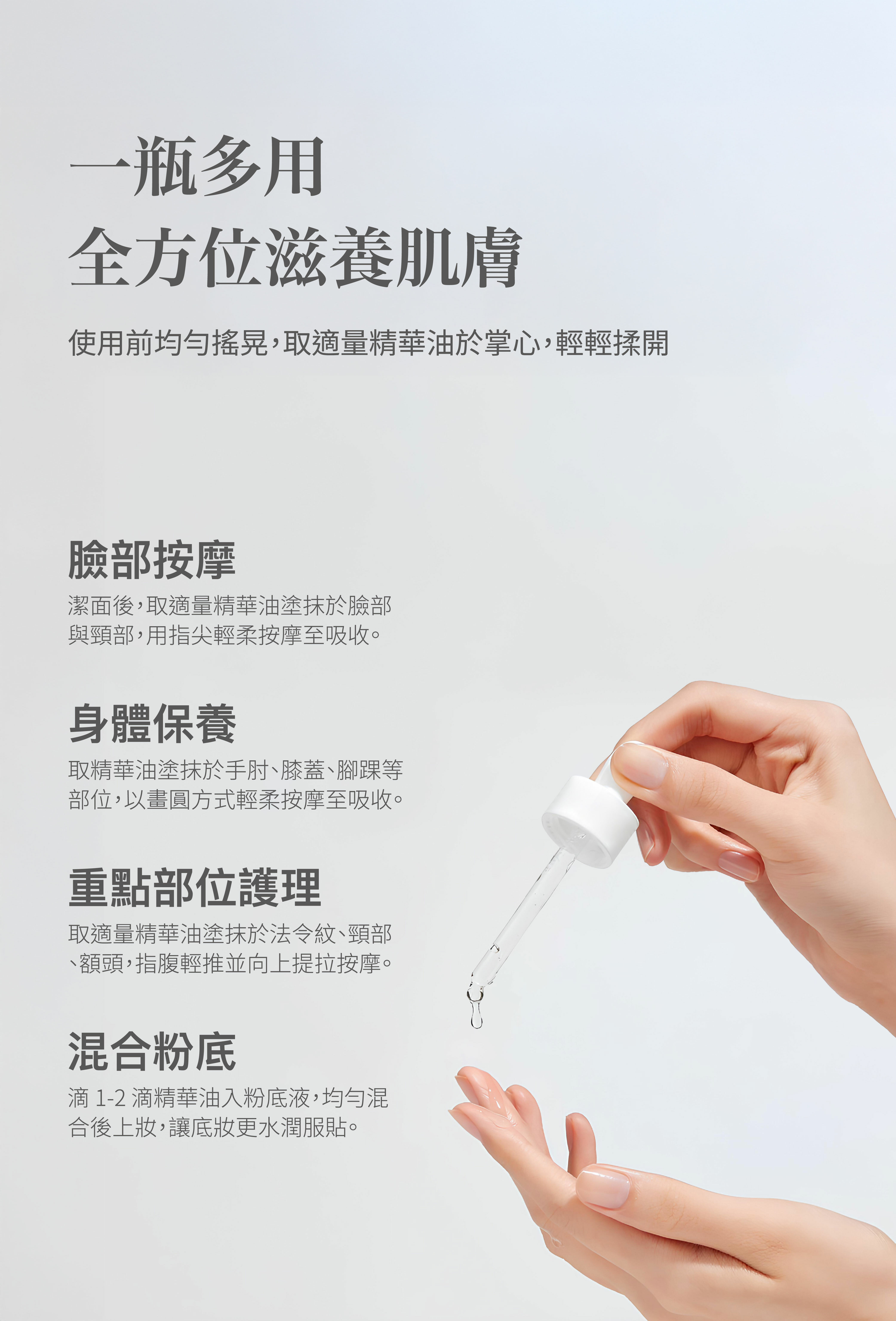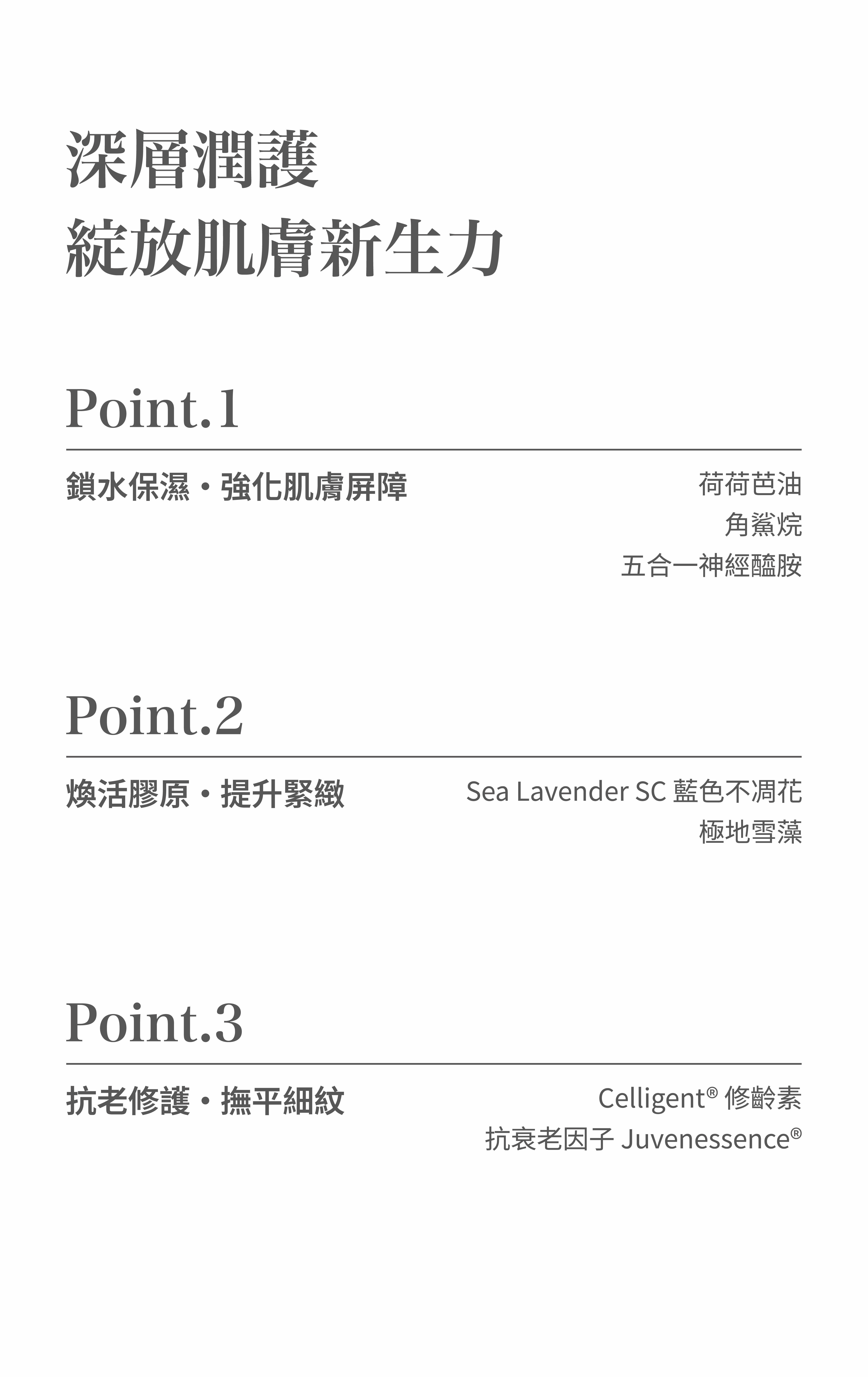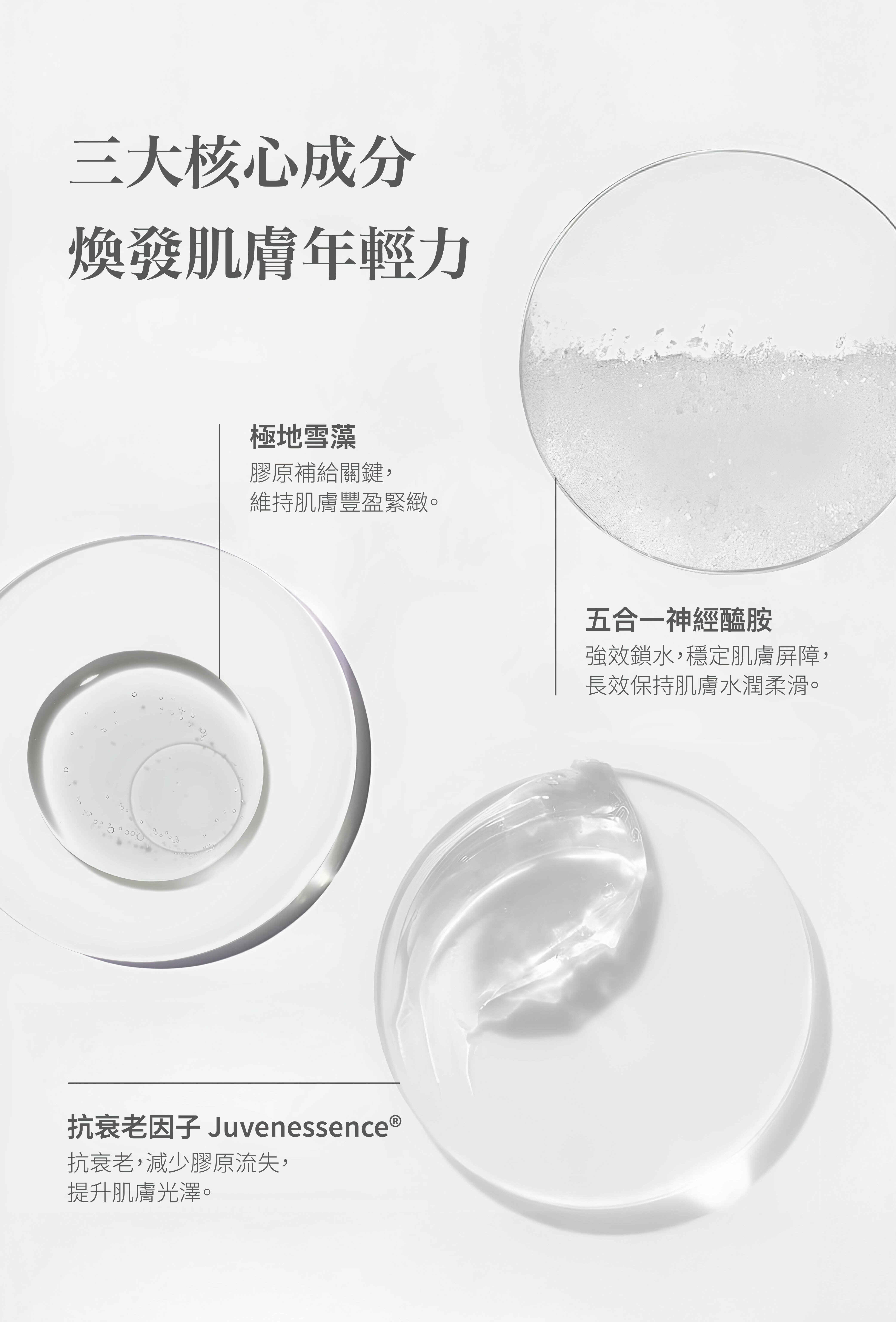 富含模擬皮膚天然脂質的神經醯胺,並結合珍稀極地雪藻精華,有效延緩肌膚老化跡象。突破性的油基配方,結合高效修護與煥活膠原成分,深層滋養、鎖水保濕,溫和呵護所有膚質,連孕婦也能安心使用。